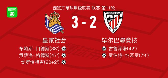 北京时间11月2日西班牙足球甲级联赛 联赛 第11轮,皇家社会主场对阵毕尔巴鄂竞技。皇家社会布赖斯-门德斯破门,贡萨洛-格德斯破门,戈罗恰特吉破门。毕尔巴鄂竞技古鲁泽塔破门,罗伯特-纳瓦罗破门。最终比分皇家社会 3-2 毕尔巴鄂竞技。
